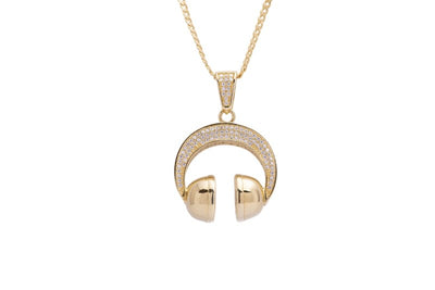 Sterling Silver DJ Headphones CZ Yellow Gold Pendant with Necklace
