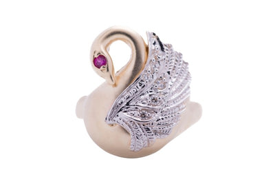 Large Swan Ruby and CZ Feathers Ring in 14k Yellow and White Gold
